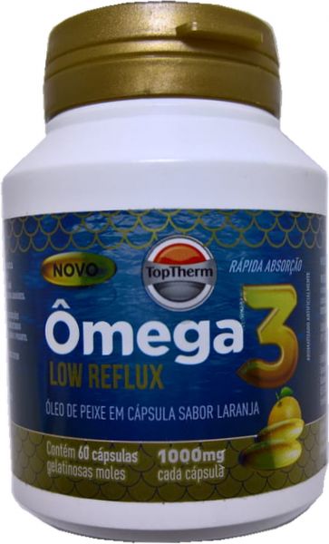 O que era bom, ficou ainda melhor. O Novo Ômega 3 Low Reflux tem fórmula desenvolvida exclusivamente para a TopTherm. Seu princípio ativo permite rápida absorção e melhor aproveitamento. O primeiro grande benefício é que você não vai sentir o gosto de peixe, depois de tomá-lo, mesmo se for em jejum. O segundo grande benefício: seu princípio ativo exclusivo permite rápida absorção e melhor aproveitamento. Bastam 02 (duas) cápsulas ao dia. Um suave sabor de laranja completa a fórmula exclusiva da TopTherm. O consumo do Ômega 3 auxilia na manutenção de níveis saudáveis de triglicerídeos, desde que associado a uma alimentação equilibrada e hábitos de vida saudáveis, como a prática de exercícios físicos.